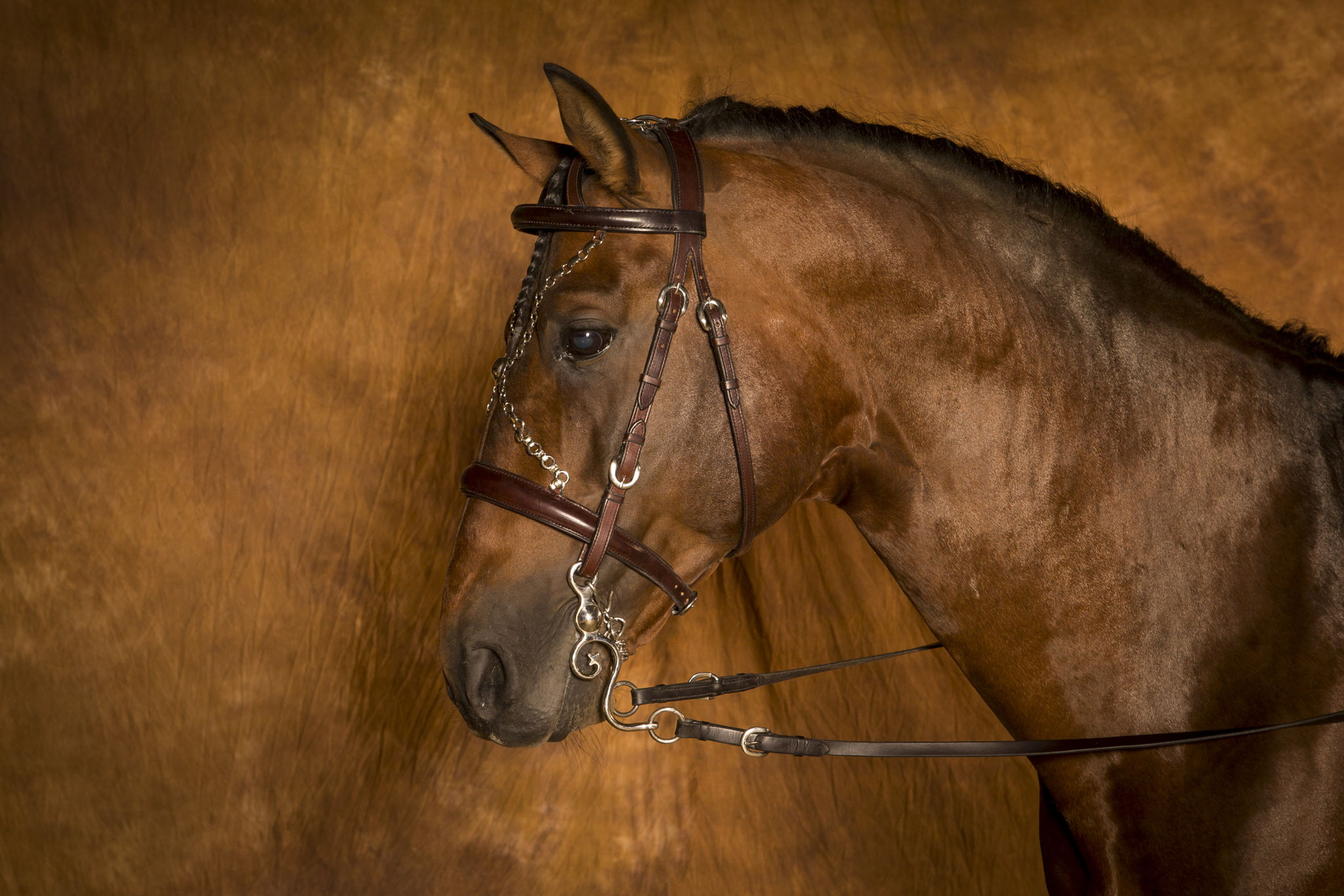 Das Stirnband und das deutsche Reithalfter sind erhaben bombiert und machen in Verbindung mit der kostbaren Stirnkette die Zäumung zu einem Schmuckstück am Pferdekopf.